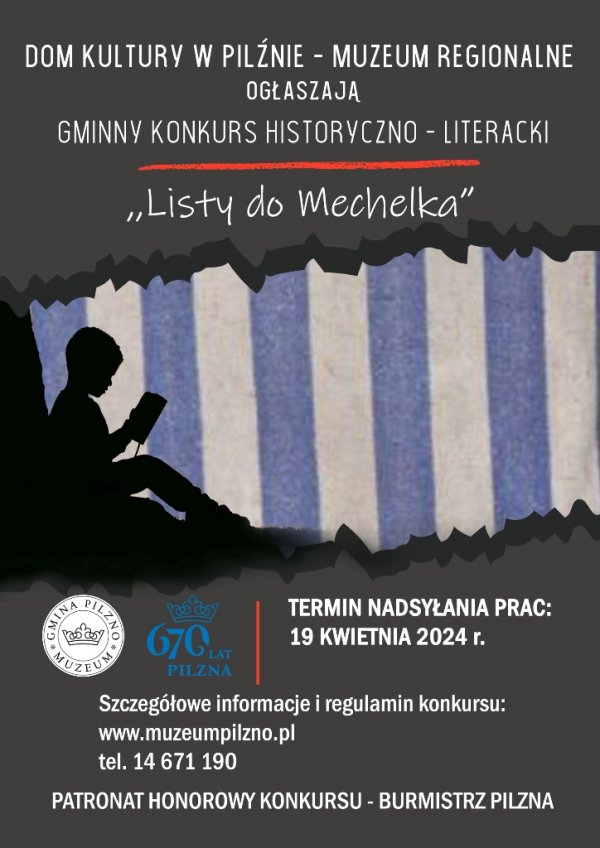 By uczcić 96 rocznicę urodzin małego Mechelka, a jednocześnie przybliżyć młodemu pokoleniu mieszkańców tragizm historii II wojny św. na obszarze Gminy, Muzeum Regionalne w Pilźnie ogłasza konkurs historyczno – literacki pt. „Listy do Mechelka”. Poszukując adekwatnej formy przekazu historii Mechelka jako symbolu całej społeczności Pilzna zdecydowaliśmy się zaprezentować tragiczną historię miasta w czasie II wojny św. podczas specjalnej prezentacji multimedialnej dla uczniów klas VII – VIII szkół podstawowych i wszystkich klas szkół ponadpodstawowych. Po zapoznaniu się z prezentacją i losami mieszkańców Pilzna w latach okupacji, chętni uczniowie poszczególnych szkół będą mogli, w przygotowanym przez siebie tekście literackim o dowolnej formie, wyrazić swoje uczucia i myśli związane z wojenną historią miasta. Jest to symboliczny akt przekazania młodemu pokoleniu pamięci o dramatycznych wydarzeniach z Zagłady.